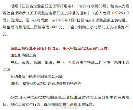 日前,根据《江苏省企业最低工资暂行规定》(省政府令第56号)和省人力资源社会保障厅《关于调整全省最低工资标准的通知》(苏人社规〔2025〕3号)的规定,经市政府同意,从2026年1月1日起南京市调整最低工资标准,调整后的月最低工资标准为2660元。非全日制用工小时最低工资标准为25元。